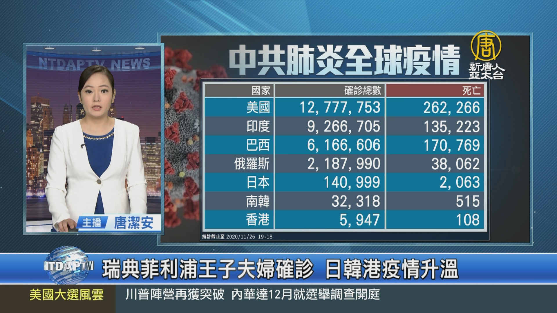 【新唐人亞太台 2020 年 11 月 26 日訊】再來關心中共肺炎疫情最新情況,全球累計確診超過6千零46萬人,1百42萬多人死亡。但中共、伊朗等國家,被認為嚴重低報數據。包括俄羅斯在內的歐洲地區,累計確診超過1千7百10萬、近38萬人死亡,是全球確診數最多的地區。美國確診超過1千2百77萬例,25日死亡超過2千4百人,創6個月來新高,累積死亡26萬2千多人。瑞典菲利浦王子夫婦成為最新確診的王室成員。蘇丹前總理馬蒂因為感染中共肺炎逝世,享年84歲。日本東京連續2天確診超過4百例,日本全國近一星期確診1萬5千人,比上週增加超過4千例。南韓新增583例,時隔將近9個月再次突破5百例,其中,首爾自疫情發生以來首次超過2百例,南韓軍方宣布,軍隊全面停止休假。香港通報81起確診,其中75例是本土感染,13例無源頭,跳舞群組染疫人數增加到311人。