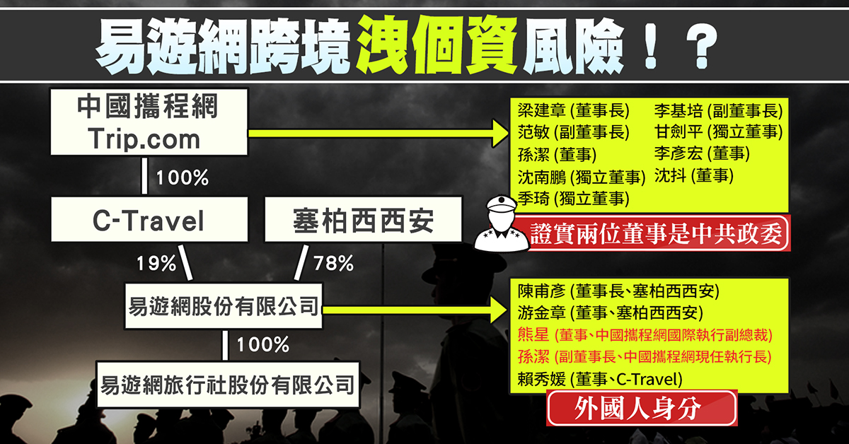易遊網董事長強調不會將個資隨便提供,但也證實,中國攜程網確實有兩位董事是中共政協委員,並表示,易遊網公司的董事中,包含中國攜程網執行副總裁熊星和中國攜程網執行長孫潔,只是兩人都已放棄中國國籍,是用外國人的身分登記。易遊網董事長 陳甫彥:「黨政軍適不適合在外國的公司裡面,而這政協身分會不會影響到,未來大家所擔心的這種中資的角度,我想那也是需要由投審會來去認定,跟未來一些新的兩岸關係法的角度。」