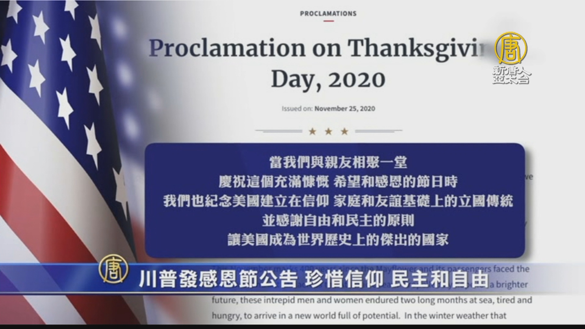 【新唐人亞太台 2020 年 11 月 27 日訊】全美歡慶感恩節,周四川普總統特別發表感恩節公告,重申對神的感恩和信仰,以及對自由、民主的珍惜。