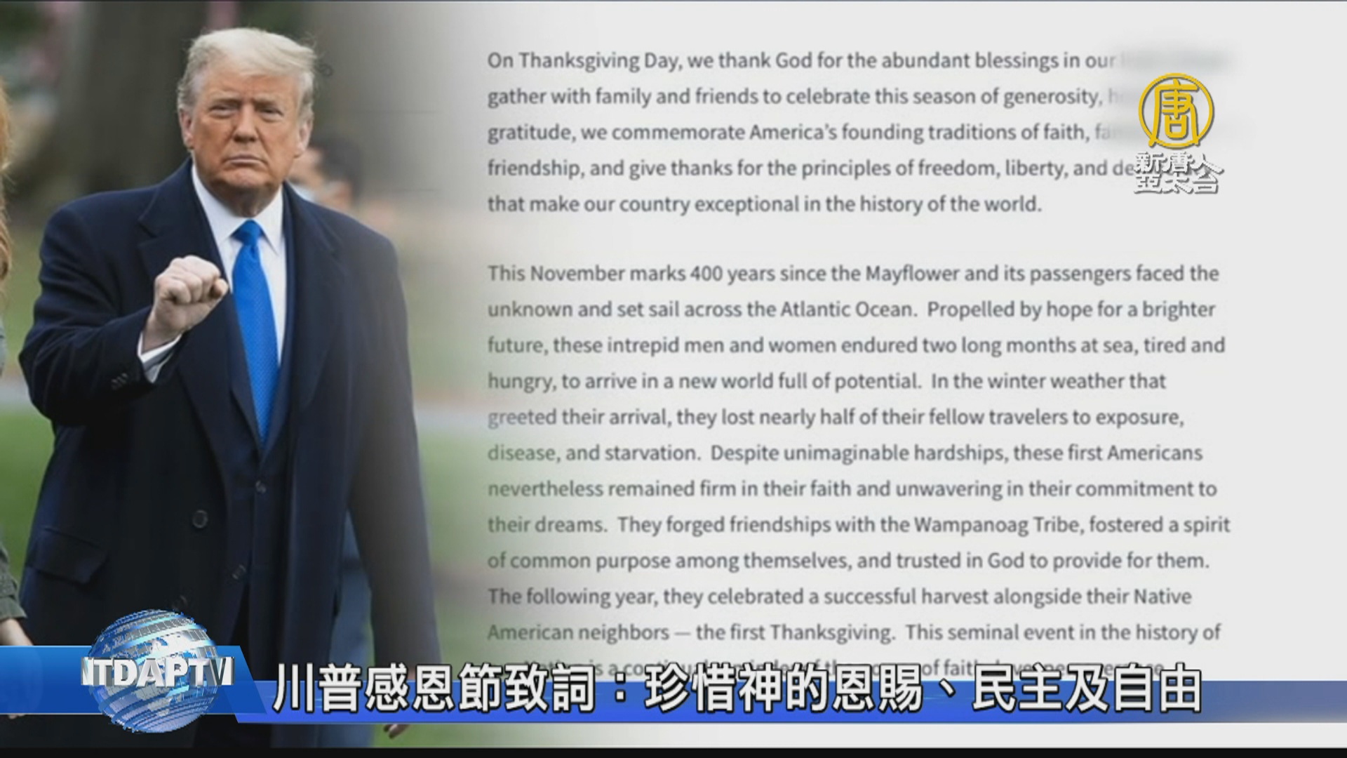 【新唐人亞太台 2020 年 11 月 27 日訊】新聞首先來看到,11月26日,是西方傳統的感恩節,全美都有活動慶祝,美國總統川普,在感恩節當天,與武裝部隊代表舉行電話會議,並發表感恩節公告,川普重申對神的感恩和信仰,以及對自由、民主的珍惜。