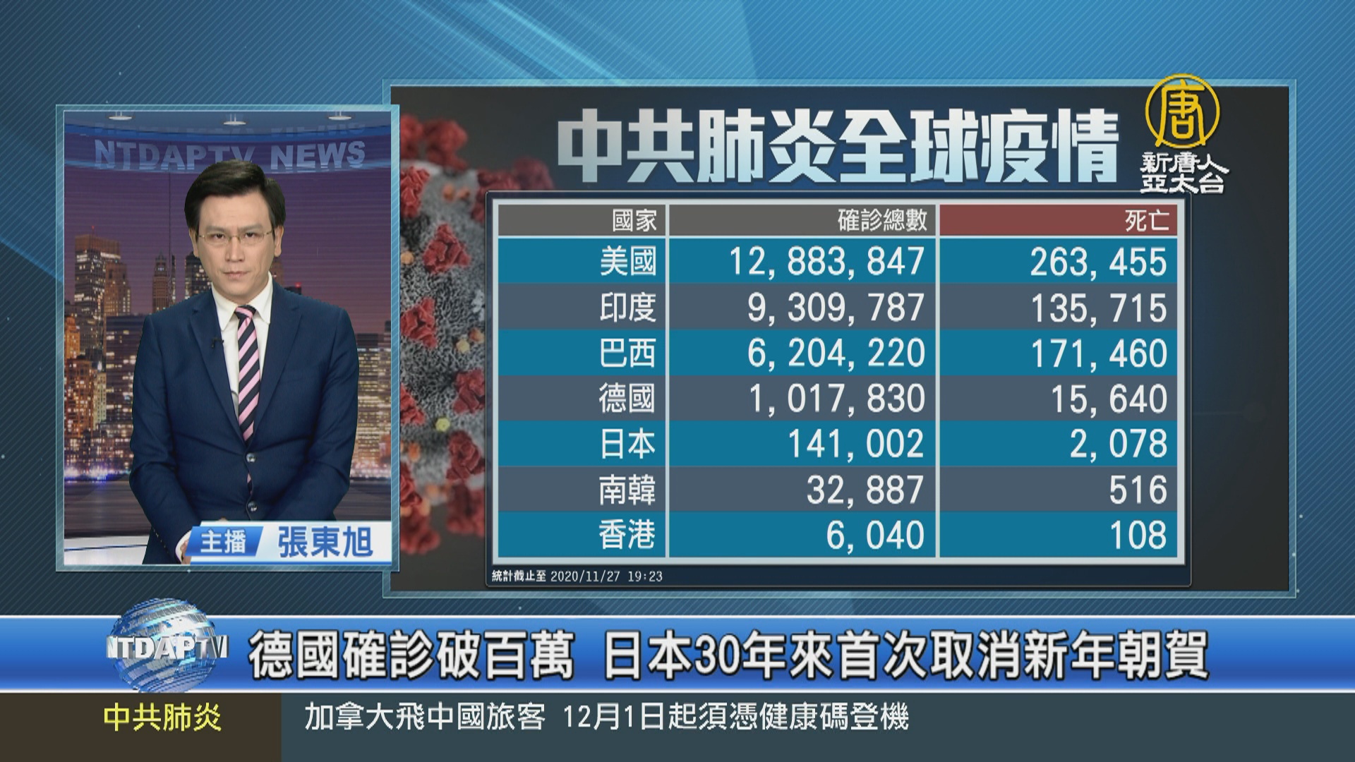 【新唐人亞太台 2020 年 11 月 27 日訊】來關心中共肺炎疫情最新情況,全球累計確診超過6千1百萬人,1百43萬2千多人死亡。但中共、伊朗等國家,被認為嚴重低報數據。美國確診超過1千2百88萬例,死亡26萬3千多人。印度新增4萬3千多例確診。德國累計染疫人數突破1百萬,成為全球第12個、歐洲第6個累計破百萬確診的國家,德國總理梅克爾26日宣布,部份封鎖措施將延長3週。日本東京新增570例確診,再創單日新高,日本宮內廳宣布,因應疫情蔓延,決定明年1月2日不會按慣例舉行新年朝賀,這也是30年來日本首次取消新年朝賀。南韓單日新增確診連2天超過5百例,預計將在週日決定是否上調防疫級別。香港再增92例確診,是8月7日以來單日最高紀錄,跳舞群組累計367人染疫。