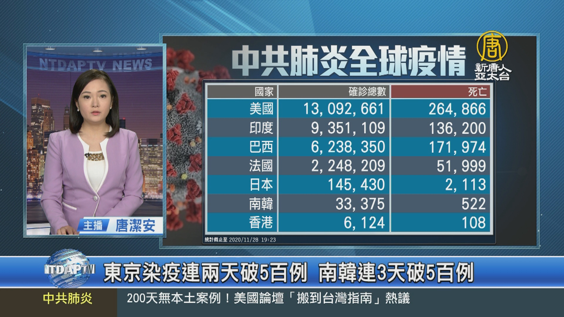 【新唐人亞太台 2020 年 11 月 28 日訊】來關心中共肺炎動態,目前全球公開數據,累計確診超過 6千1百70萬人,其中144萬人死亡。美國累計確診超過 1千3百萬例,死亡 26萬4千多人。染疫人數最多國家,美國之後依序為印度、巴西、法國及俄羅斯。另外,日本東京新增 561例確診,已連續2天超過 5百例,日本全國累計 14萬5千多例確診,死亡2千多人。南韓新增確診 504例、死亡6人,已連續3天,確診突破5百例。香港新增確診 84例,有81例是本土感染,其中多達 27例源頭不明。另外,中共、伊朗等國家,被認為嚴重低報數據。