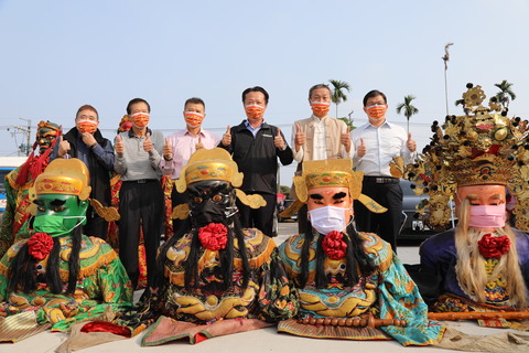 「秋冬防疫專案」12月1日起啟動,嘉義縣結合廟方宣傳戴口罩。(嘉義縣政府提供)