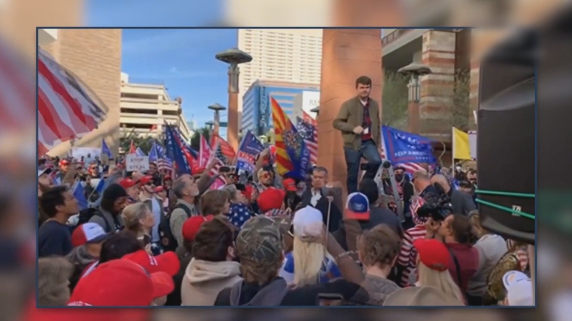 亞利桑那州選民週六(11月28日)在鳳凰城集會,揮舞支持川普的旗幟,高呼「美國優先」等口號。