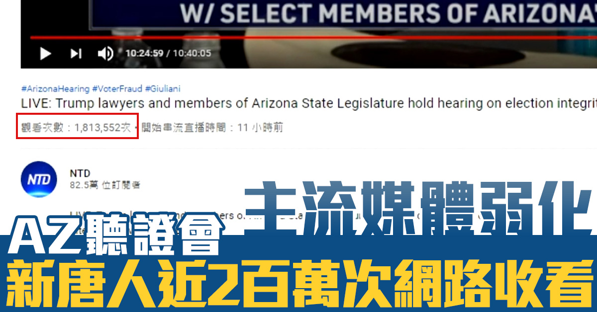 【新唐人亞太台 2020 年 12 月 01 日訊】11月30日,當亞歷桑那州議會舉行聽證會,美國主流媒體大多都報導州務卿認證拜登微弱差距當選,而不去直播或報導這場有大量指證的10小時聽證會,新唐人電視以中英文在不同頻道直播,英語新唐人Youtube直破,直播剛結束就累積180萬人次觀看。在線同時收看人數最高時超過15萬人,累計已超過兩百萬人次觀看。