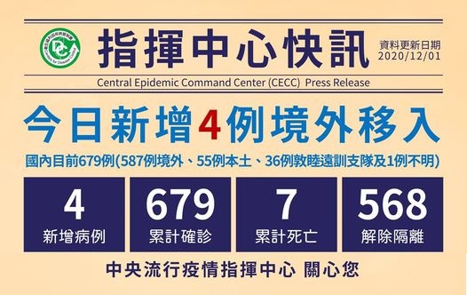 【新唐人亞太台 2020 年 12 月 01 日訊】今(1日)中央流行疫情指揮中心公布國內新增4例境外移入中共肺炎病例,分別自菲律賓(案677)、印尼(案678)、英國(案679)及白俄羅斯(案680)移入。
