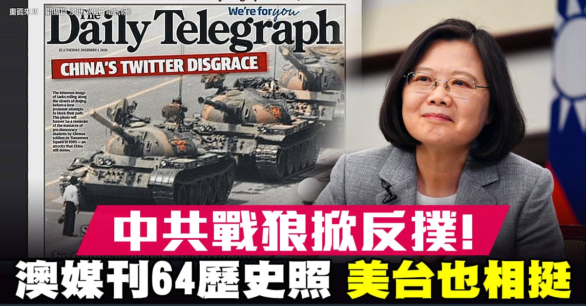 澳洲《每日電訊報》頭版刊出六四天安門廣場坦克人的照片,並寫道「對中共軍人殺害中國平民和學生感到震驚,我們強烈譴責這種行為,呼籲追究他們的責任。」文末更特別標註「這張照片是真的。」這項動作,正是要回擊日前中共外交部發言人趙立堅,在推特上貼出毀謗澳洲軍人的電腦製圖。