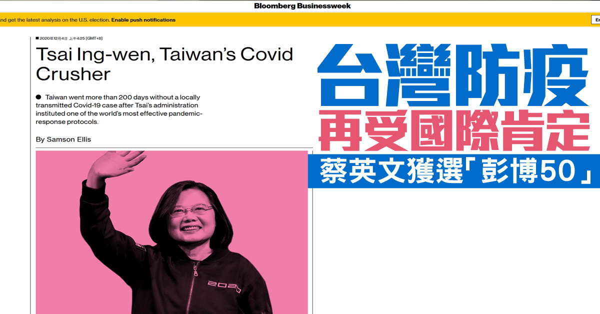 蔡英文領導不只獲美方肯定,更獲選彭博今年公布全球最具影響力人物50人名單。彭博內文以「蔡英文,台灣中共肺炎的終結者」為題,提到蔡總統年初連任成功,即便處在競選衝刺的最後階段,她的政府仍忙於實施各項措施,台灣已有200多天沒出現本土確診案例,很有機會成為今年少數幾個能正成長的經濟體。文末不忘提醒蔡政府仍須謹慎,因為之前幾個防疫有成的國家,現在也面臨疫情捲土重來。