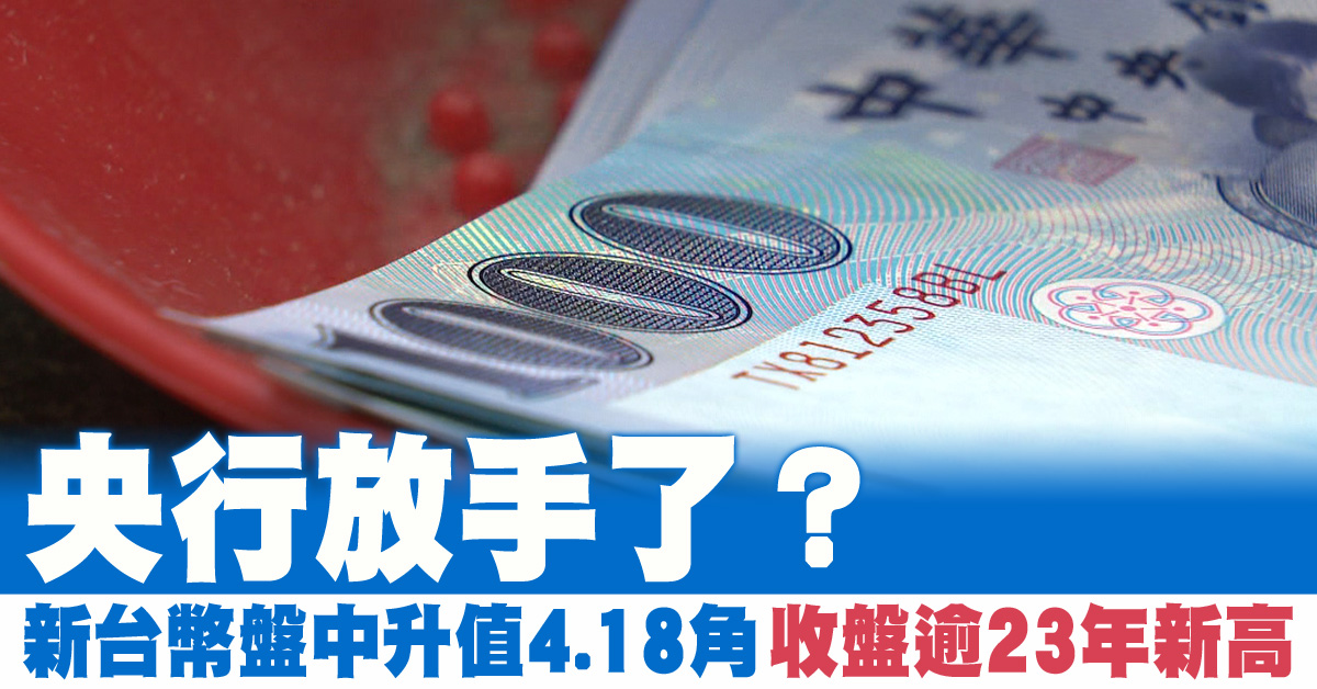 央行放手了?新台幣盤中升值4.18角 收盤逾23年新高