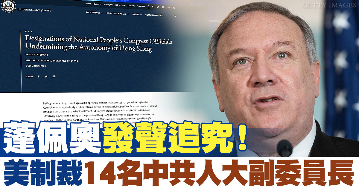美國國務卿蓬佩奧(Mike Pompeo)12月7日發表聲明,指出北京對香港民主進程的不斷無情攻擊,已破壞了香港立法會,使其成為一個沒有實質反制力量的橡皮圖章。美國國務院要追究這些進行無恥魯莽行為( brazen acts)的責任人,將制裁14名制訂、通過、實施港版國安法的中共人大副委員長。