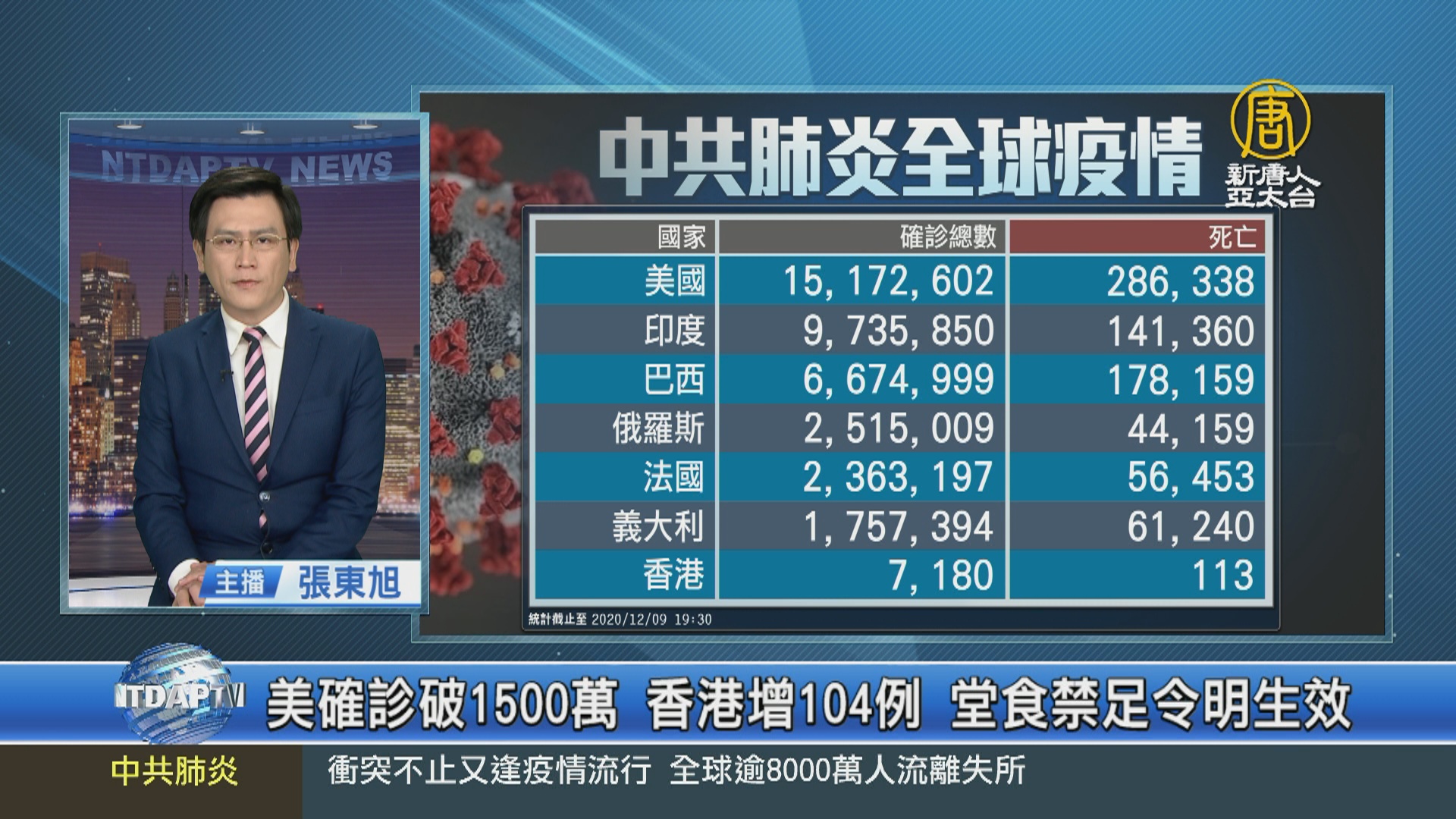 【新唐人亞太台 2020 年 12 月 09 日訊】來關心中共肺炎動態,目前全球公開數據,累計確診超過 6千8百32萬人,死亡達到156萬人。美國確診飆破 1千5百萬例,在過去四天增加了 100萬例,平均每天超過 20萬人染疫。在過去7天,平均每天超過 2千人死亡,直逼4月時疫情高峰,累計超過 28.6萬人死亡。另外,歐洲在過去7天,新增確診數逼近全球新增的 40%,但新增病例數比前一週下降了 2%,疫情稍微趨緩。另外,香港今天確診 104例、其中 35例源頭不明,週四(10日)凌晨起,餐廳晚上禁止內用,並關閉酒吧、健身中心、美容院等場所。另外,中共、伊朗等國家,被認為嚴重低報數據。