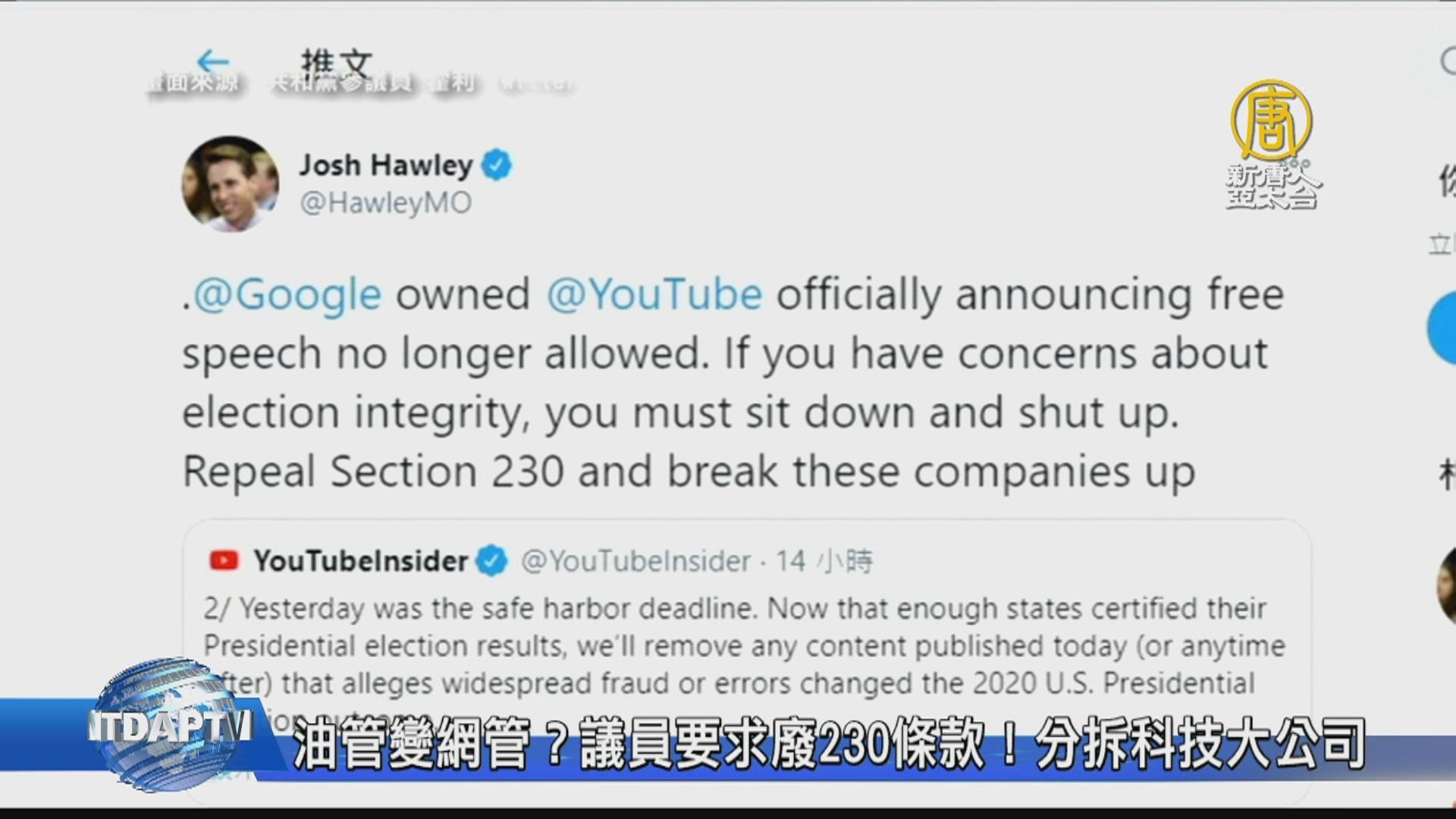【新唐人亞太台 2020 年 12 月 10 日訊】YouTube進行內容審查,宣布將刪除所有與美國大選舞弊相關的的影片,也引發美國政要譴責。共和黨參議員霍利推文說,Google擁有的Youtube正式宣布,不再允許言論自由,如果你關心大選的公正性,你只能閉上嘴巴乖乖坐好,他呼籲廢除230條款並且分拆這些科技巨頭公司。眾議院共和黨領袖麥卡錫則諷刺的說,還記得Youtube在2016年如何反擊左翼媒體對川普的打壓,但顯然的,每當言論立場不符合科技巨頭的利益時,那麼它就變成是危害人民的觀點。