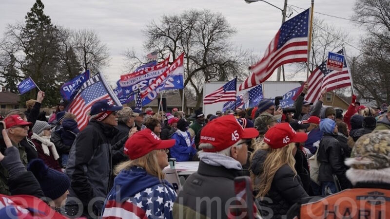 週六(11月14日),威斯康星州密爾沃基市(Milwaukee)的川普支持者在塞爾維亞館的宴會廳外舉行了第二次「捍衛選票」集會行動。(溫聖緣/大紀元)