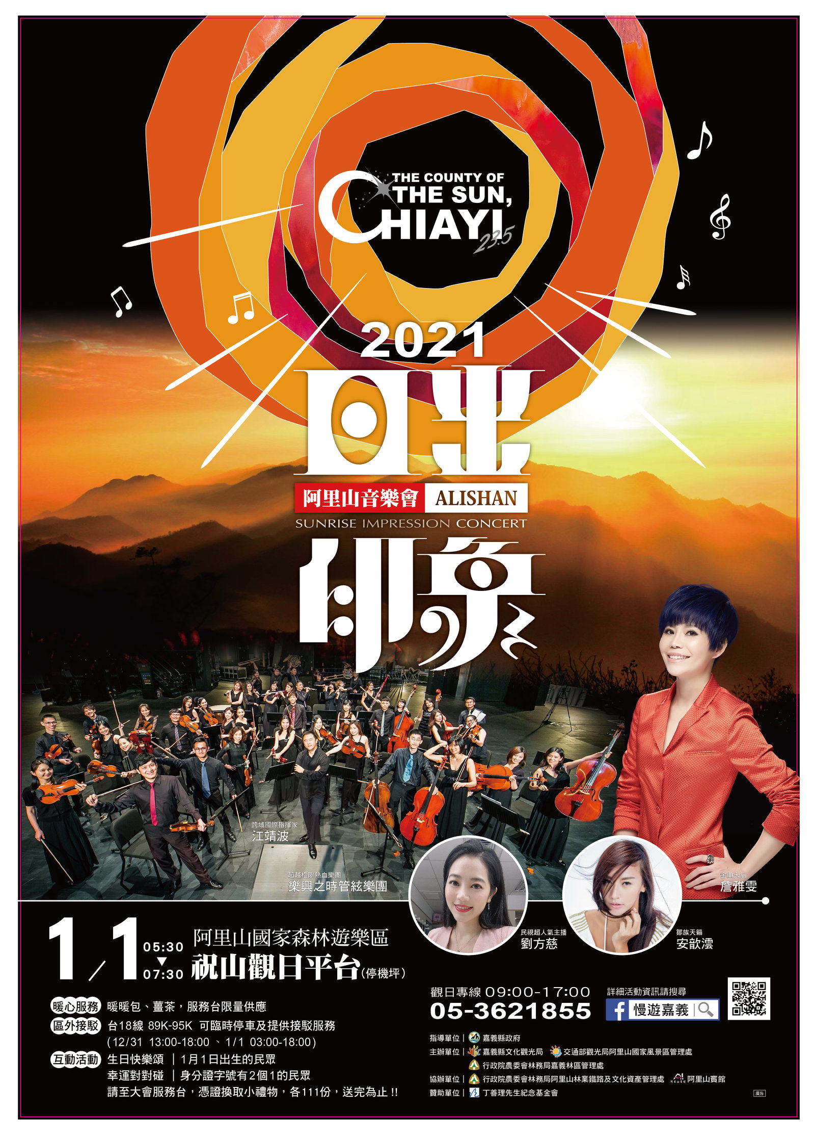 文化觀光局指出,這次活動特邀金曲歌后詹雅雯、鄒族天籟安歆澐,並邀約由跨域國際指揮家江靖波帶領的「樂興之時管弦樂團」50人團隊跨界演出。同時也邀請民視主播劉方慈現場主持,要陪伴全台民眾一起迎接新年的阿里山第一道曙光。