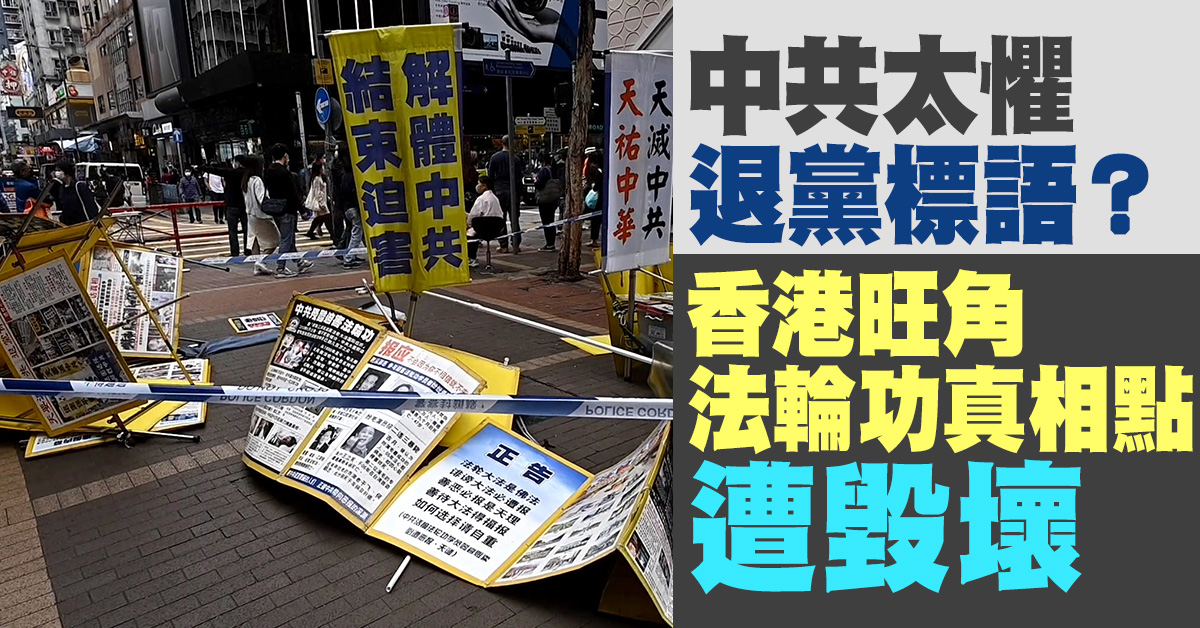 中共太懼退黨標語?香港旺角法輪功真相點遭毀壞