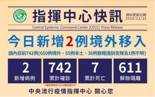 【新唐人亞太台 2020 年 12 月 15 日訊】今(15日)中央流行疫情指揮中心公布,新增2例境外移入中共病毒確定病例,分別為菲律賓籍30多歲女性移工(案742)及印尼籍30多歲男性移工(案743)。