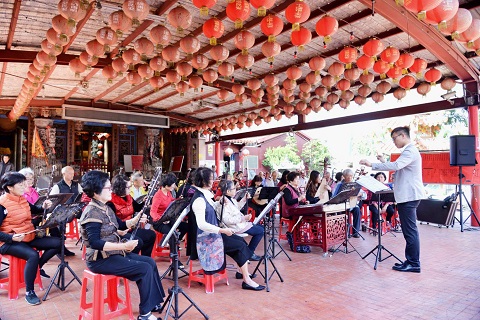 為了宣傳這場「最炫賢拜音樂會」,今天(16日)上午由水上長青國樂團與橋下國樂團打頭陣,在璿宿上天宮—水上媽祖廟聯合演出搶先看。