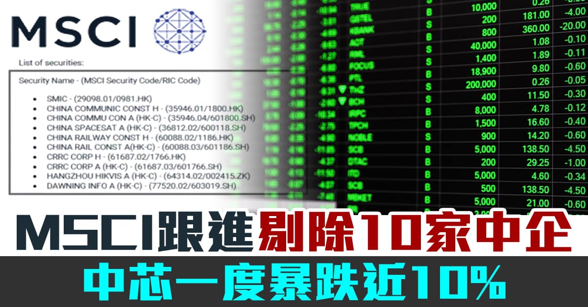 MSCI跟進剔除10家中企 中芯一度暴跌近10%