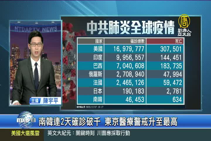 【新唐人亞太台 2020 年 12 月 17 日訊】繼續關心中共肺炎疫情最新情況,全球確診超過7千4百24萬人,死亡1百64多萬人。但中共、伊朗等國家,被認為嚴重低報數據。美國確診超過1千6百97萬例,死亡30萬7千多人,加州洛杉磯單日新增確診破2萬,美國內政部長柏恩哈德病毒檢測呈陽性反應。法國總統馬克宏確診,進行7天自我隔離。瑞士前總統柯提傳出因染疫病逝,享壽81歲。日本東京昨天才創下最高紀錄的單日新增確診678例,今天又增加822例,再度刷新紀錄,東京也首度將醫療警戒等級提升到最嚴重的「醫療體制緊迫」。南韓新增1千014人染疫,連續2天破千,死亡增加22人,是疫情爆發來單日最多人死亡。香港新增96例確診,其中26例源頭不明。