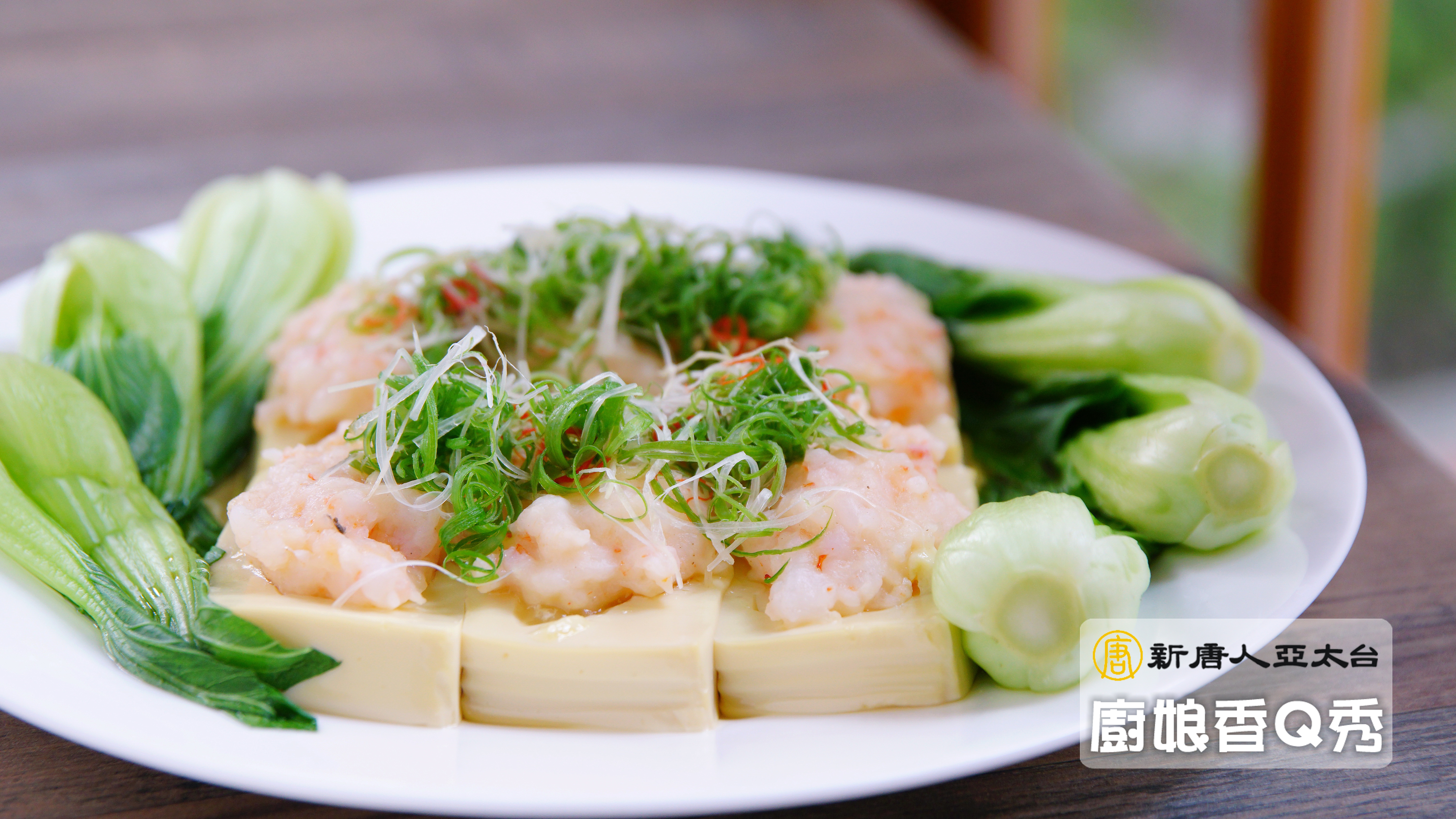 食材:雞蛋豆腐300公克、青江菜150公克、白表粒30公克、草蝦仁120公克、蔥絲20公克、薑絲10公克、辣椒絲10公克、魚露20公克、醬油20公克