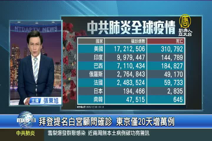 【新唐人亞太台 2020 年 12 月 18 日訊】再來關心中共肺炎動態,目前全球公開數據,累計確診 7千5百多萬人,累計死亡166萬人。其中,中共、伊朗等國家,被認為嚴重低報數據。美國消息,拜登將提名的白宮高級顧問人選里奇蒙德,傳出確診。美國目前累計 1千7百21萬人確診,31萬人死亡。日本累計確診 19萬4千多例,其中東京單日新增 6百64例,累計突破 5萬例;在過去20天,東京就增加了 1萬例。韓國疫情嚴峻,新增確診 1千零62例,連續3天單日新增超過 1千例;韓國累計確診 4萬7千多起,其中 6百45人死亡。