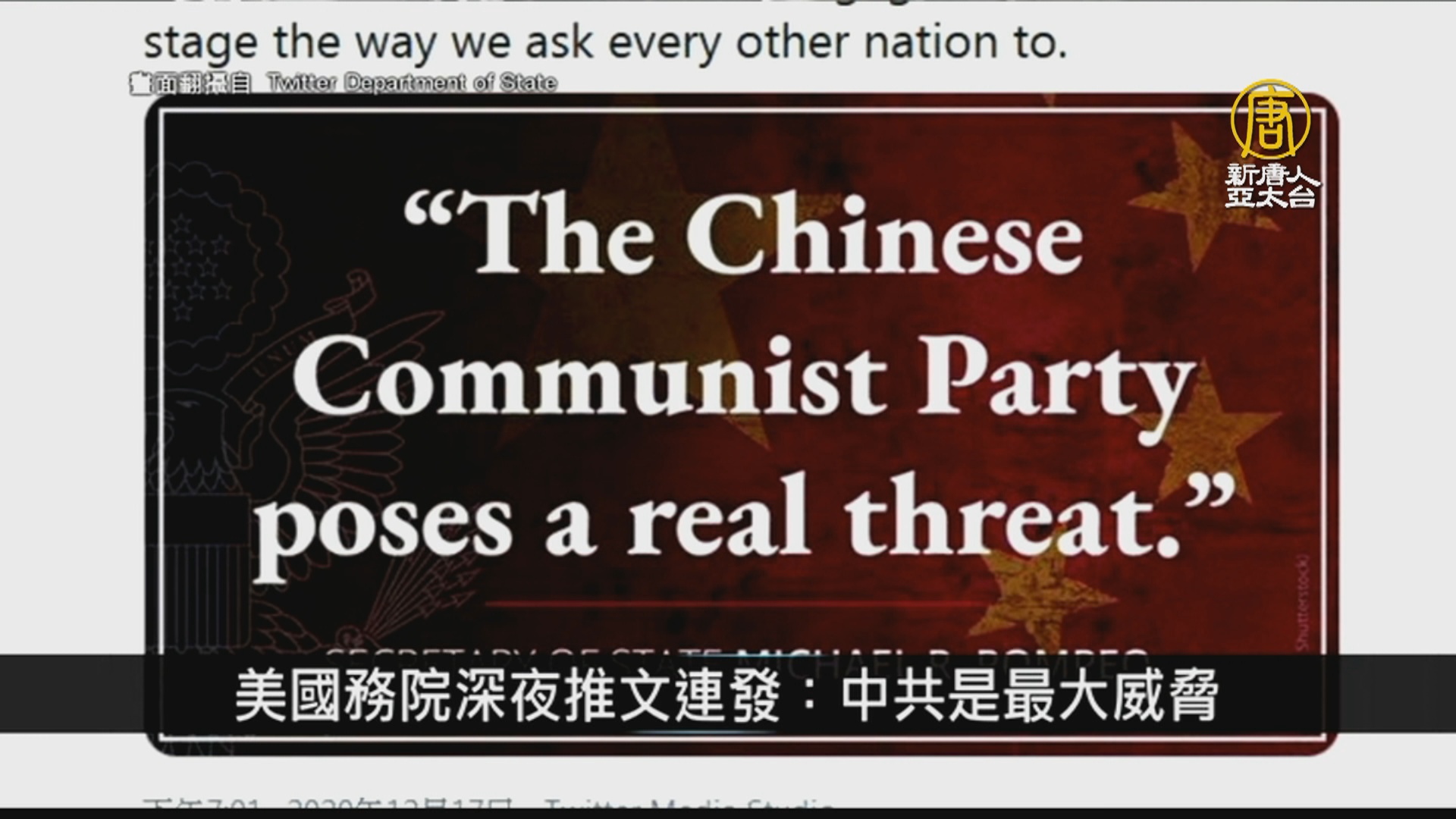 【新唐人亞太台 2020 年 12 月 18 日訊】美國務院深夜推文連發:中共是最大威脅
