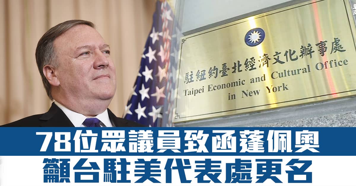 78位眾議員致函蓬佩奧 籲台駐美代表處更名