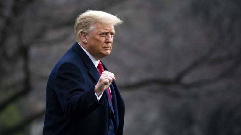 2020年12月12日,川普總統前往紐約州西點軍校參加陸軍對海軍的足球賽前,在白宮南草坪上揮舞拳頭。(Al Drago/Getty Images)