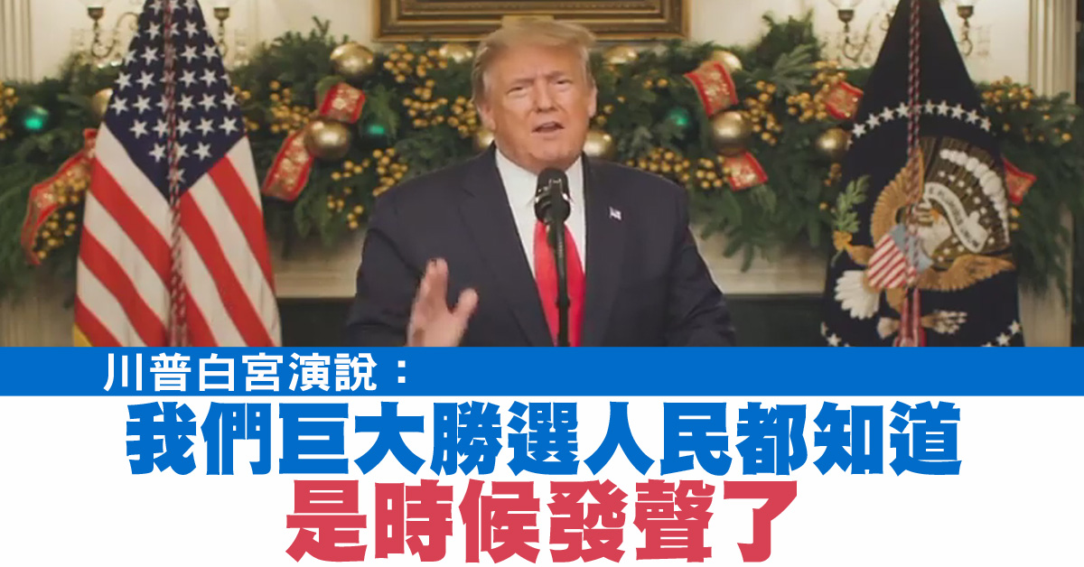 美國總統 川普:「現在是美國人民發聲,並要求立即糾正這種不公正現象的時候了。我們的選舉必須公正,必須誠實,而且必須透明。他們必須是百分百零舞弊。我們以巨大的勝利贏得了這次選舉。美國人民們都知道,他們抗議。他們很憤怒。他們很恐懼。我們不能允許這種完全舞弊的選舉存在著。」