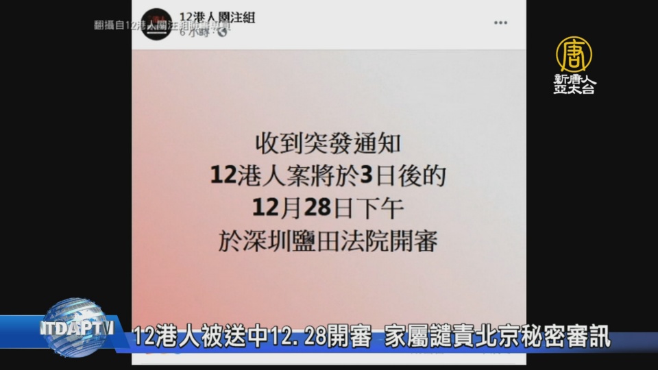 【新唐人亞太台 2020 年 12 月 25 日訊】再來關心香港,12名港人今年8月搭船偷渡前往台灣,途中被中共海警攔截,扣留在深圳,已被秘密關押超過四個月,有家屬在25日收到通知,當中十人12月28日審訊,另外兩人由於未滿18歲,將由檢察院聽證會處理,日期未知。家屬發出聲明表示,法院在審訊前3天才發出通知,家屬已無法親自趕往法庭旁聽,對於北京當局將「秘密審訊」12名港人,予以強烈譴責,認為這種做法完全漠視基本人權價值。家屬提出要求,全程直播庭審、讓家屬代表、家屬委託律師、香港及國際媒體到場旁聽。