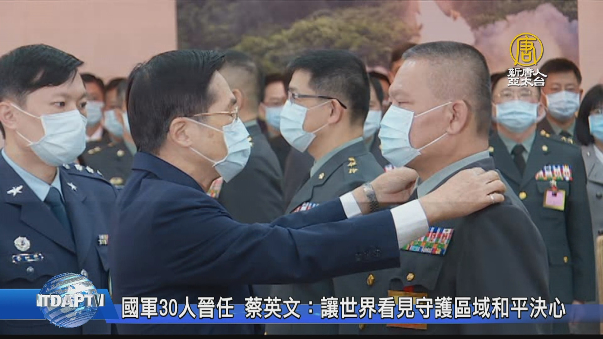 【新唐人亞太台 2020 年 12 月 29 日訊】總統蔡英文上午(29)出席將官布達暨授階典禮,勉勵30位剛晉升的新科將領,並現場交付兩項任務,包括持續精進本職學能、持續培養優秀人才,並強調,讓世界看見捍衛國家守護區域和平決心。