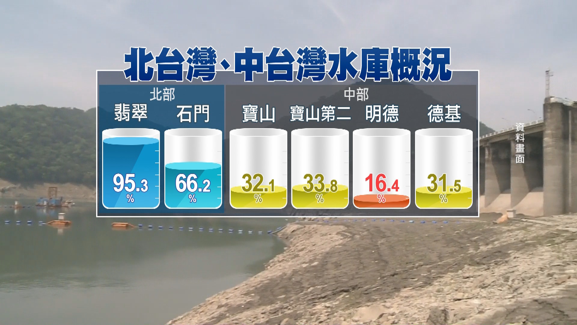 目前北台灣翡翠水庫,水量回到滿水位,石門水庫約66%,不過中台灣方面,新竹寶山兩座水庫,存量只剩下30%,只夠支撐最多2個月,苗栗明德水庫亮紅燈剩下16.4%,供應台中的德基水庫,也只剩31.5%,竹苗台中將進入二階段「橙燈」(減量供水)。新竹科學園區,未來可能分階段減量供水5%到20%,影響相當巨大。