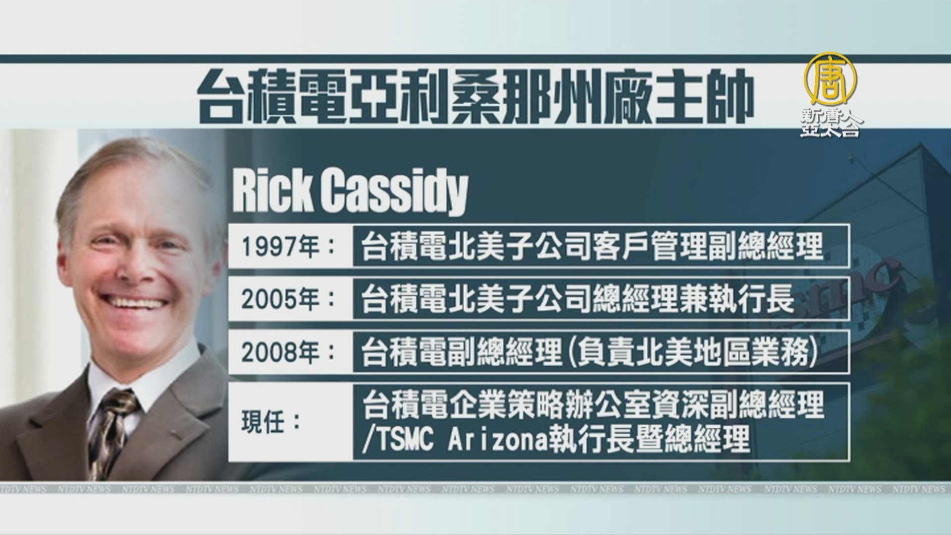 【新唐人亞太台 2020 年 12 月 31 日訊】今年五月,台積電宣布要在美國亞利桑那州新建一座12吋先進晶圓廠,即將在明年動工。統籌負責人正式亮相,是目前擔任台積電企業策略辦公室的副總經理 凱西迪 ,將接任新廠的執行長與總經理職務。週三,台積電 ADR上漲 3.16%,創歷史新高。