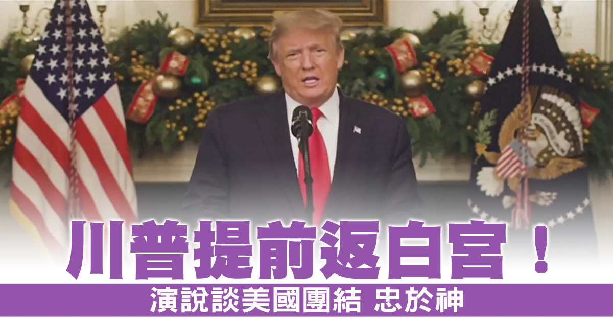 【新唐人亞太台 2021 年 01 月 01 日訊】2021年新年前夜,美國總統川普突然取消出席在佛州的新年宴會,提前返回白宮。媒體分析,面對國防法案和紓困法案紛爭、大選之戰多線並行、變異病毒再次肆虐等情況,川普總統有很多事情需要處理。今天台北時間凌晨,川普再次在推特釋出影片。