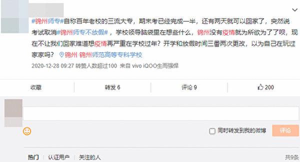 「黃瀨夫人」說:「錦州師專封校?寧配嗎?寧的硬件設施能滿足學生需求嗎?最開始一直不公布放假時間,導致學生搶不到高鐵票,後來臨時通知提前放假占了學生一個週末,考試前一天晚上又出爾反爾,最絕的是還不讓學生發朋友圈說學校不好,搞監視那一套,這時候才知道要臉了???……」