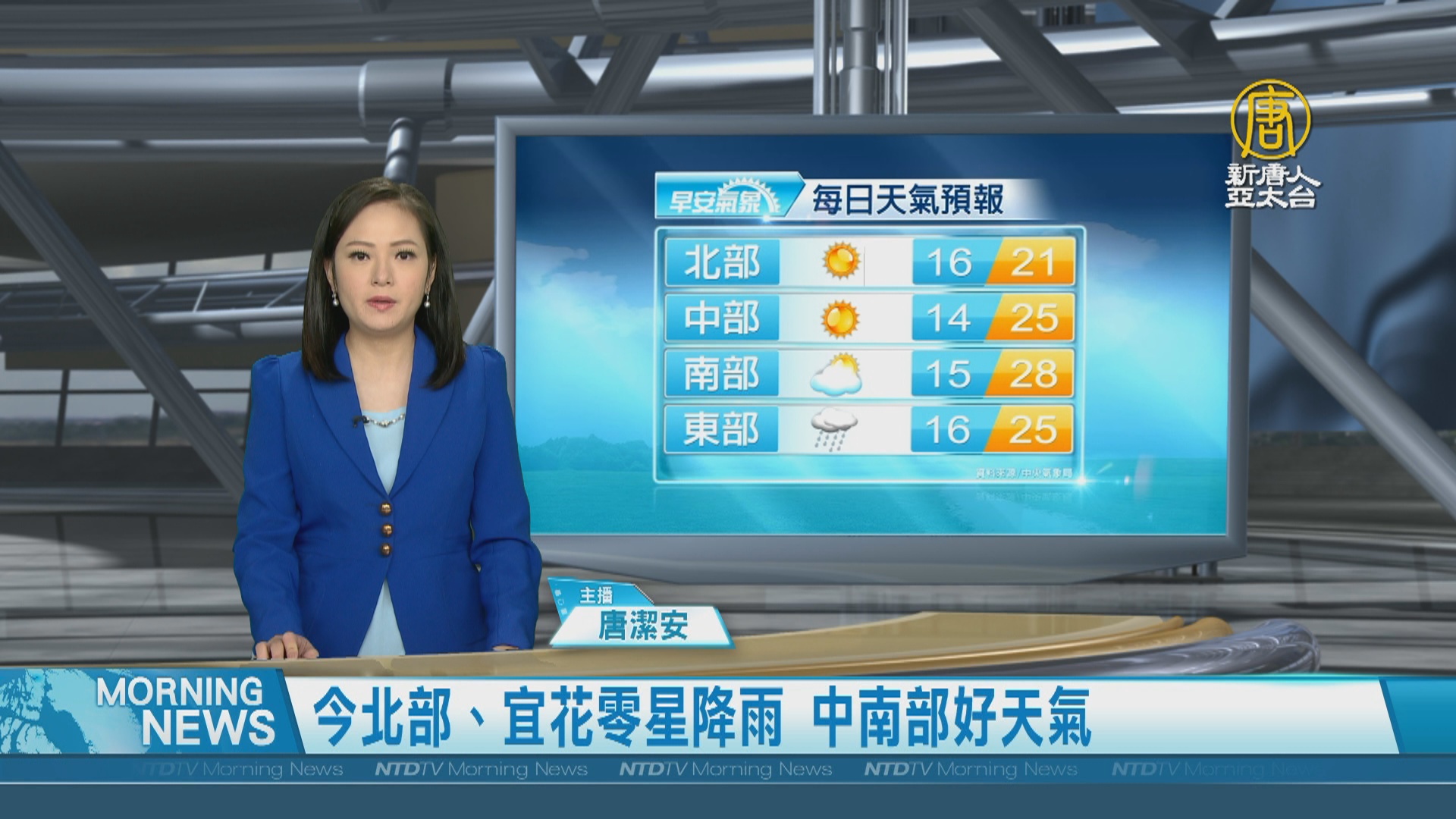 【新唐人亞太台 2021 年 01 月 04 日訊】歡迎您收看1月4日的早安新唐人,我是唐潔安,先來帶您關心今天的天氣情況。結束元旦假期,又是一個星期的開始了,今天各地天氣大致穩定,只有北海岸、宜花地區有零星降雨,北部雲量稍多,也有機會零星飄雨。各地氣溫持續回升,但夜間清晨仍涼,中南部日夜溫差大,提醒觀眾朋友注意保暖。帶您一起來看到國際媒體重要訊息。