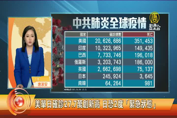 【新唐人亞太台 2021 年 01 月 04 日訊】來關心中共肺炎疫情最新情況,全球確診超過8千5百08萬人,死亡1百84多萬人。但中共、伊朗等國家,被認為嚴重低報數據。疫情最嚴重的美國2日通報新增27萬7千多人確診,再創單日新高紀錄,死亡超過35萬1千人,川普在推特發文批評,確診與死亡數字「誇大」。英國連續6天單日確診超過5萬例,在野黨工黨黨魁施凱爾呼籲政府,在24小時內宣布全面封城,以遏止失控的變種病毒。為了防疫情進一步擴散,日本首相菅義偉考慮發布首都?一都三縣緊急事態宣言,預定從9日零時開始。