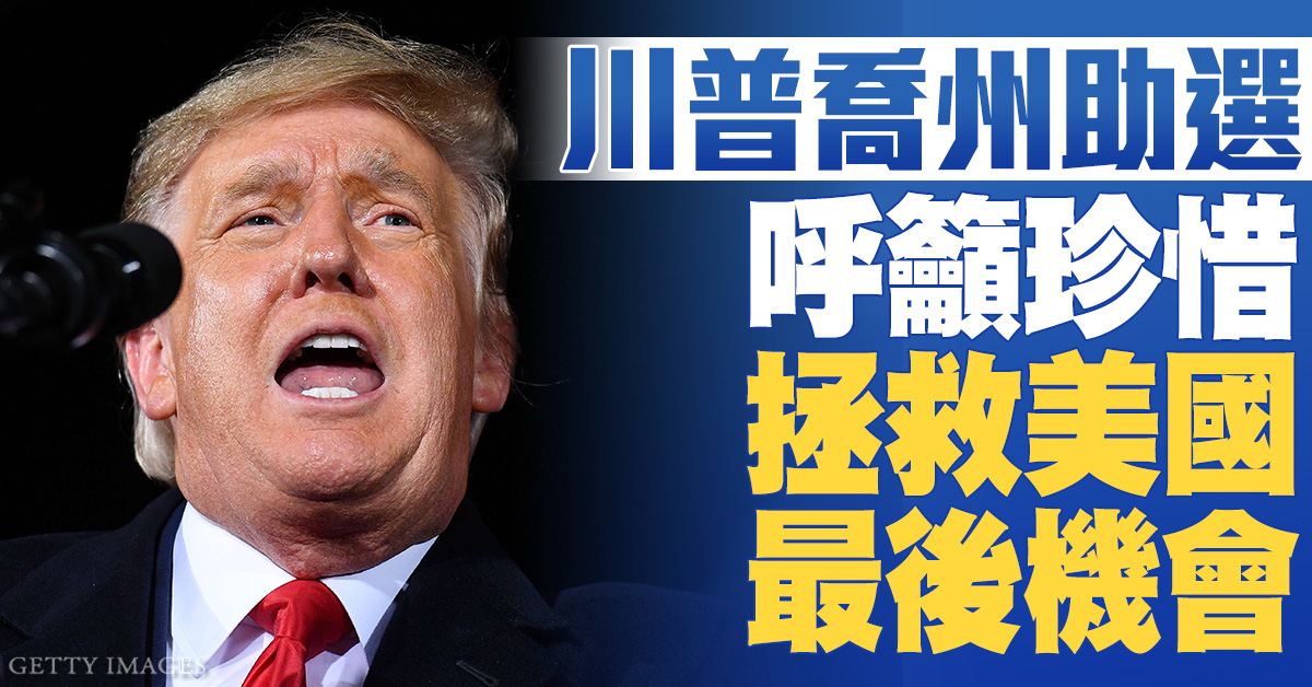 【新唐人亞太台 2021 年 01 月 05 日訊】週一,美國總統川普前往喬治亞州,為共和黨在喬治亞州的參議員候選人站台。川普呼籲選民,把握拯救美國的最後機會。