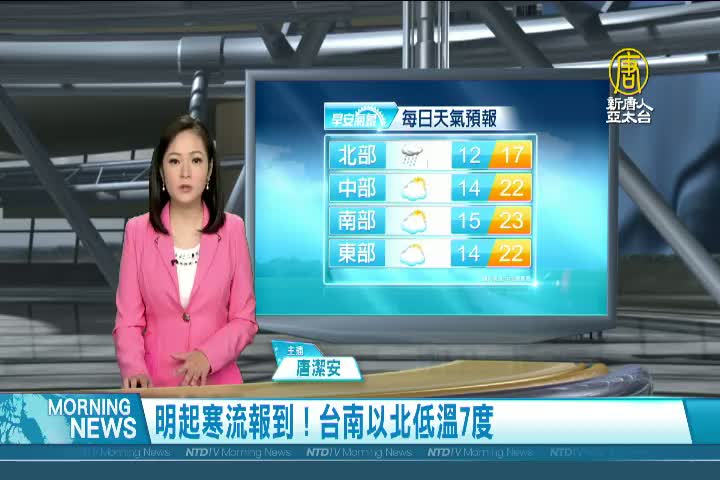 【新唐人亞太台 2021 年 01 月 06 日訊】歡迎您收看1月6日的早安新唐人,我是唐潔安,先來帶您關心今天的天氣情況。今天起基隆北海岸及大台北山區仍可能有大雨發生;明天星期四開始,寒流南下,台南以北低溫攝氏7至9度,天氣溼冷;星期天1月10號短暫回溫,下週一1月11號又會再降溫,北台灣可能會有10度左右低溫,提醒您留意保暖。帶您一起來看到國際媒體重要訊息。