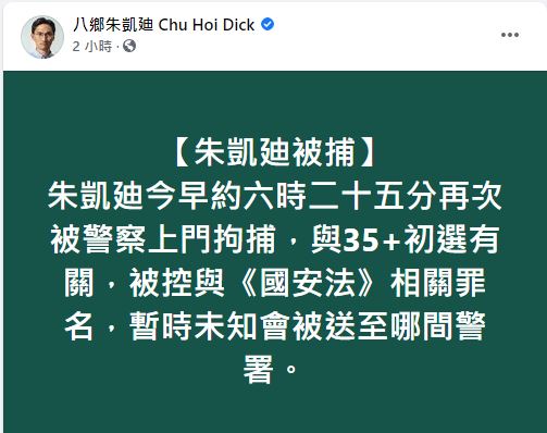 前立法會議員范國威、朱凱廸、梁國雄、前香港眾志副主席、南區區議員袁嘉蔚、中西區區議員梁晃維、屯門區議員張可森、荃灣區區議員岑敖暉、元朗區區議員王百羽、荃灣區區議員譚凱邦、沙田區區議員岑子杰、前《立場新聞》記者何桂藍、民間集會團隊發言人劉頴匡,和九龍西地區組織半島連線召集人馮達浚、12港人關注組成員鄒家成、前學民思潮發言人黃子悅,今早也被上門拘捕。