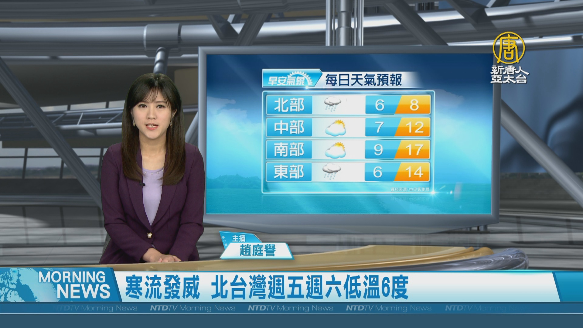 【新唐人亞太台 2021 年 01 月 08 日訊】歡迎您收看1月8日的早安新唐人,我是趙庭譽,先來帶您關心今天的天氣情況。寒流發威。今天全天至明天是這波寒流最強的時刻,北台灣今天低溫都在10度以下,其他地區約9度到12度;星期天。寒流稍微減弱,白天氣溫稍回升,但下周一強烈大陸冷氣團,將再度南下,提醒觀眾朋友留意。帶您一起來看到國際媒體重要訊息。