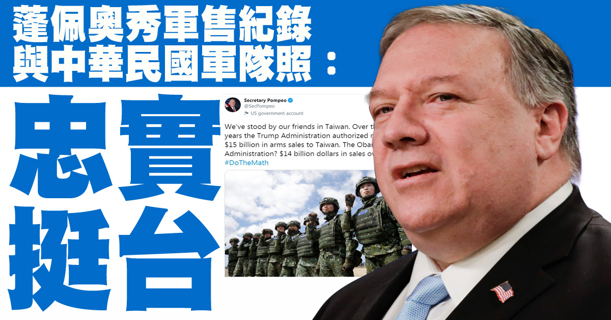 美國國務卿蓬佩奧在推特發文,特地秀出中華民國國軍照片,他表示忠實支持台灣友人,過去3年川普政府批准總額超過150億美元(約新台幣4300億元)的對台軍售案;相較於前總統歐巴馬(Barack Obama )政府,8年任內對台軍售僅140億美元。中華民國立委王定宇指出,美國對台軍售常態化,而且跟以往軍售不同,提供的是最新的美軍現役裝備。