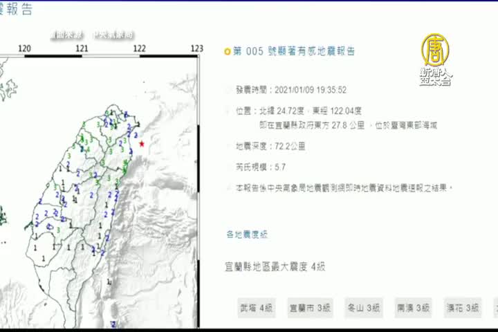 【新唐人亞太台 2021 年 01 月 09 日訊】新聞開始先關心,今晚國家級地震警報響起,晚間7點35分,規模5.7地震,震央在台灣東部海域深72公里,宜蘭和新竹震度最大有4級,其他地區,包括,台北、花蓮、桃園、南投、台中、苗栗、彰化、嘉義都是3級。