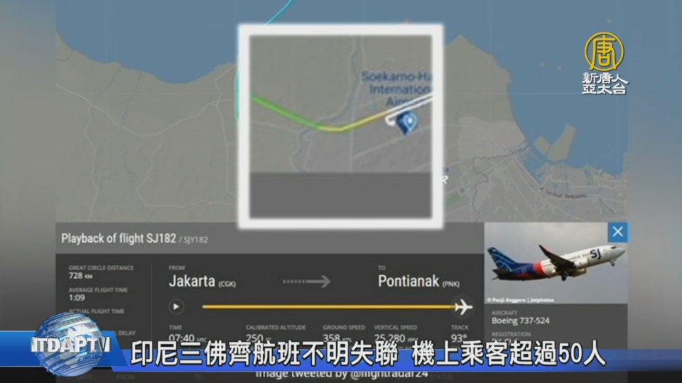 【新唐人亞太台 2021 年 01 月 09 日訊】為您插播國際快訊,印尼交通部指出,一架棣屬於三佛齊航空的波音737-500客機,今天(1/9)下午起飛後不久失聯,最後聯絡的時間是當地2點40分。據瞭解,這架班機是下午2點36分在雅加達的蘇加諾-哈達國際機場起飛後,便在機場北方的爪哇海域失去聯繫,機上乘客超過50人。