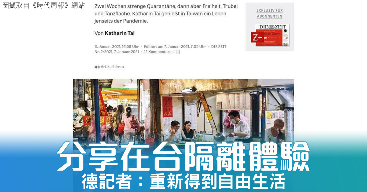 德國記者凱特琳(Katharin Tai)去年入境台灣後,隨即在社群媒體介紹台灣防疫精密設計的隔離措施,獲得許多回響,本月6日則在德媒《時代周報》以「正常」為題撰文,分享她在台灣接受隔離的經驗,大讚在在台灣享受著全球疫情下的另外一種生活-重新得到「自由」的感覺。