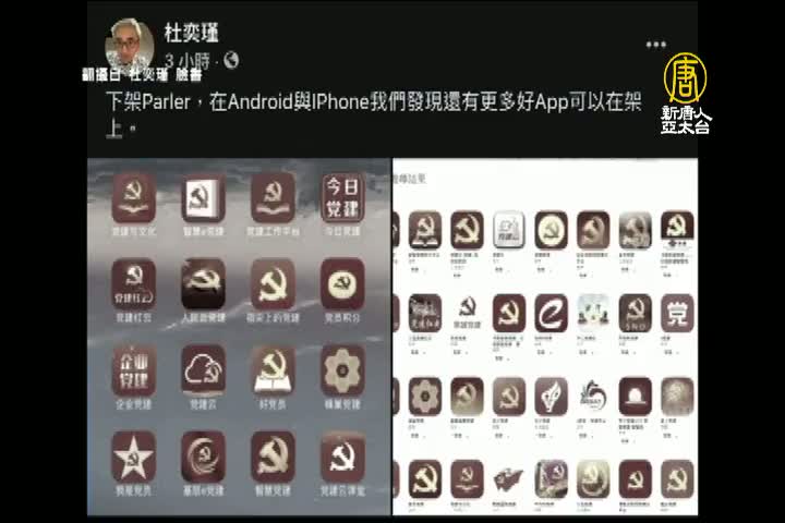 【新唐人亞太台 2021 年 01 月 11 日訊】科技巨頭永久停權、凍結川普帳號後,還將突破封鎖的Parler平台下架。台灣網路專家與時事評論員,舉出「雙重標準」的顯著例子,指出科技巨頭對待中國共產黨卻不是如此。台灣PTT創辦人杜奕瑾臉書貼文寫到「Google、Apple因稱政治宣傳下架Parler。那這個App怎麼審的?」,發現在app查詢「黨建」關鍵字,出現許多中國共產黨相關App。