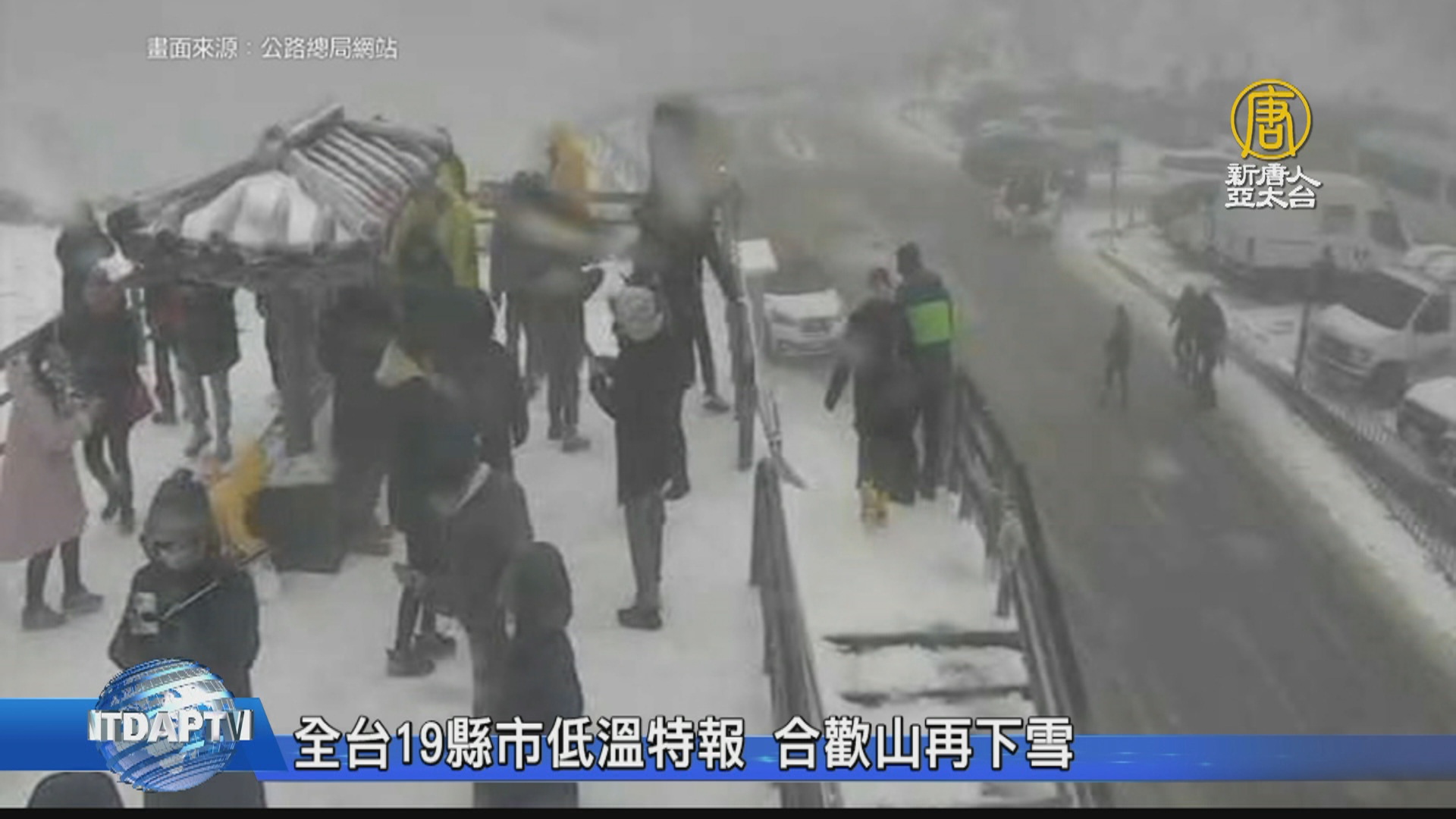 【新唐人亞太台 2021 年 01 月 11 日訊】今天寒流南下,各地氣溫逐漸下降,氣象局針對全台19縣市發布低溫特報,今天到明天局部地區有持續10度左右或6度以下氣溫發生的機率,請觀眾朋友要注意防範。另外,根據合歡山的監視器即時影像,武嶺亭還在持續下雪中,地上再度鋪滿厚厚白雪,吸引不少遊客上山賞雪拍照。
