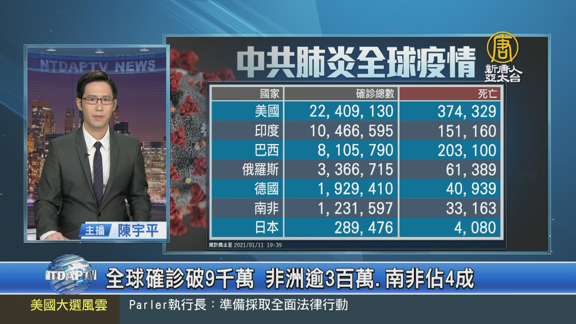 【新唐人亞太台 2021 年 01 月 11 日訊】再來關心中共肺炎疫情最新情況,全球確診突破9千萬人,死亡1百93多萬人。但中共、伊朗等國家,被認為嚴重低報數據。疫情最嚴重的美國在今年的前10天,已通報超過2百20萬人確診、超過2萬7千人死亡,累計死亡超過37萬4千多人。非洲確診數突破3百萬例,其中,南非超過1百20萬例確診,約占全非洲的4成。德國10日宣布,死亡累計超過4萬例,總理梅克爾警告,未來幾週才是疫情最艱難階段。日本東京連續7天新增超過1千例確診,並從巴西抵達日本的4名確診旅客中,檢出不同於英國與南非發現的全新變種病毒。太平洋島國 密克羅尼西亞通報首例確診病例,從地球上僅存少數幾個未染疫的地區除名。