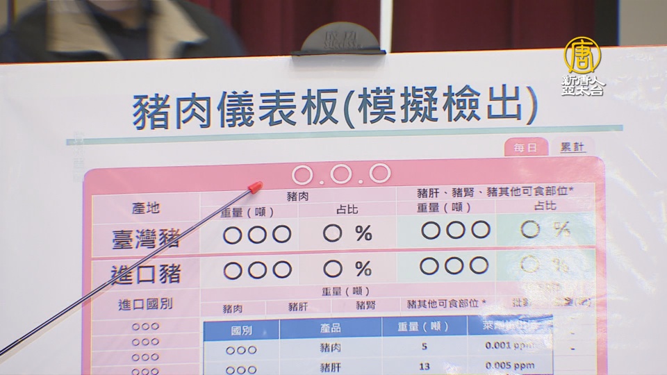 【新唐人亞太台 2021 年 01 月 11 日訊】萊豬來了嗎?中央開放萊豬進口後,發表「豬肉儀表板」網站,上頭有每天的進口豬肉數據及是否含有萊劑,不過卻被發現和食藥署的邊境查驗系統有出入,明明1月4日就有淨重超過108噸的美豬進口,「豬肉儀表板」上卻沒顯示。對此,食藥署強調,豬肉通過食藥署查驗後,還得等關務署放行,儀表板才會顯示,未來將會修正系統,盡量讓兩邊的資訊能夠同步。今日(1/11)的儀表板已更新,有96公噸的美豬進入市面。