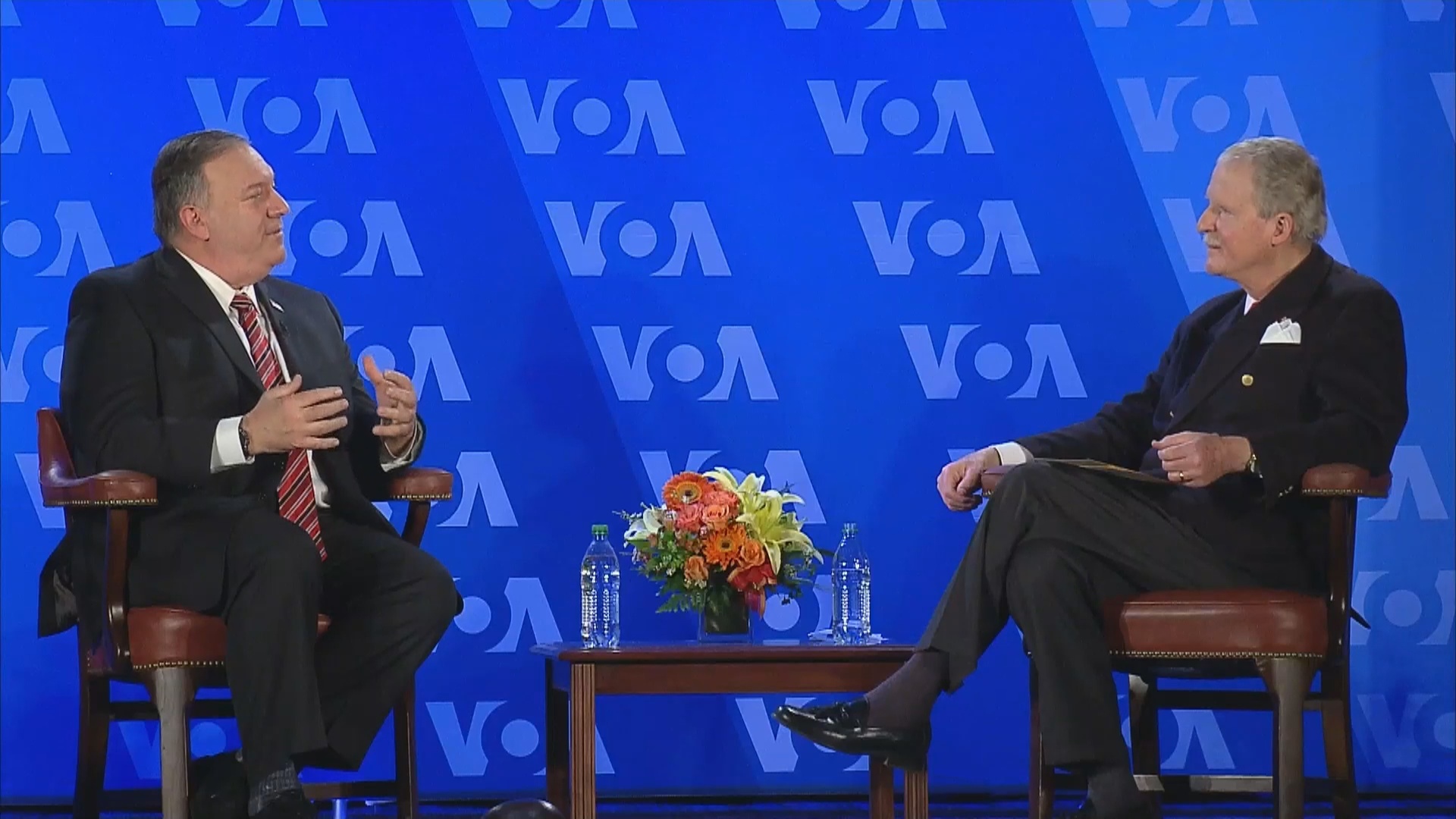 蓬佩奧:鮑勃,事實上這個挑戰是全面性的。我們的行政當局對此先從經濟方面著手。(川普)總統對中國貨物徵收了關稅,力圖制止知識產權盜竊,這種盜竊讓美國失去了數千萬的工作,因為他們會盜竊信息,把它拿回中國,進行制造,然後又拿到美國來傾銷。這是信息。你談到了這點。這是仍在持續中的。